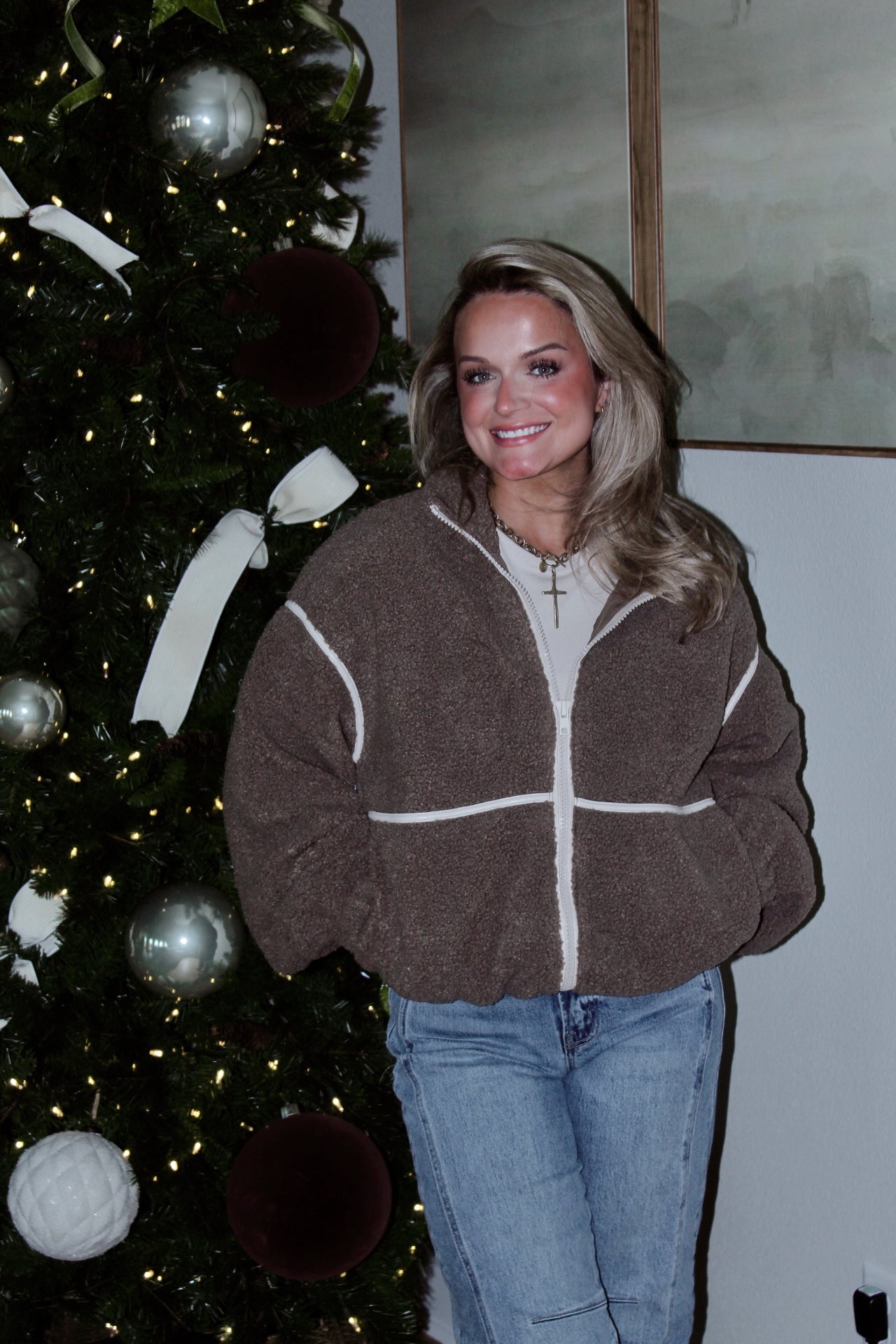 Faux Leather Sherpa Zip-Up Jacket - Stone