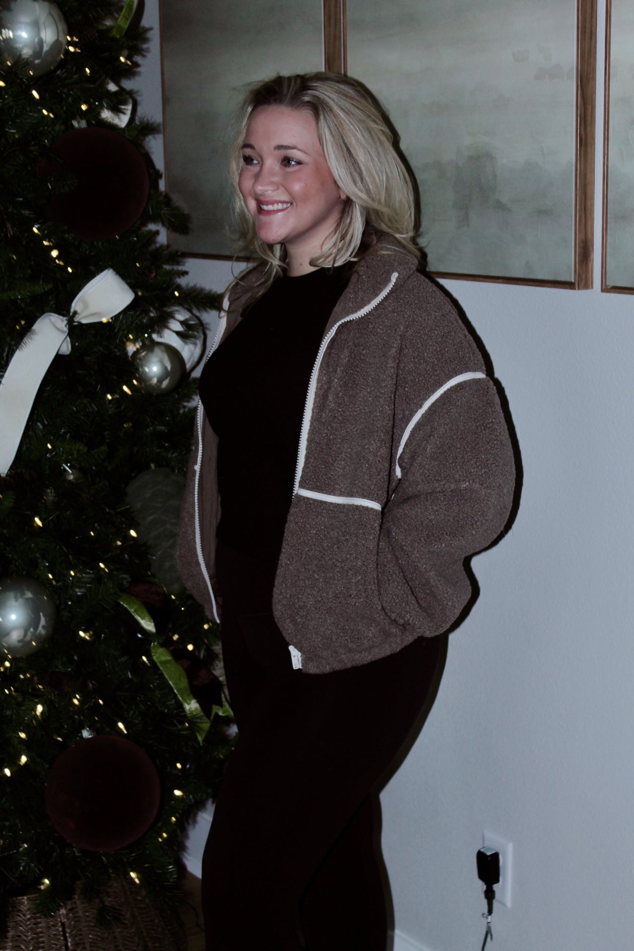 A solid sherpa fleece jacket with the following features: High collar. Zip-up front closure. Long sleeves with elastic cuffs. Dropped shoulder. Side pockets. Faux leather trim throughout. Elastic hem. Full lining. Relaxed fit.