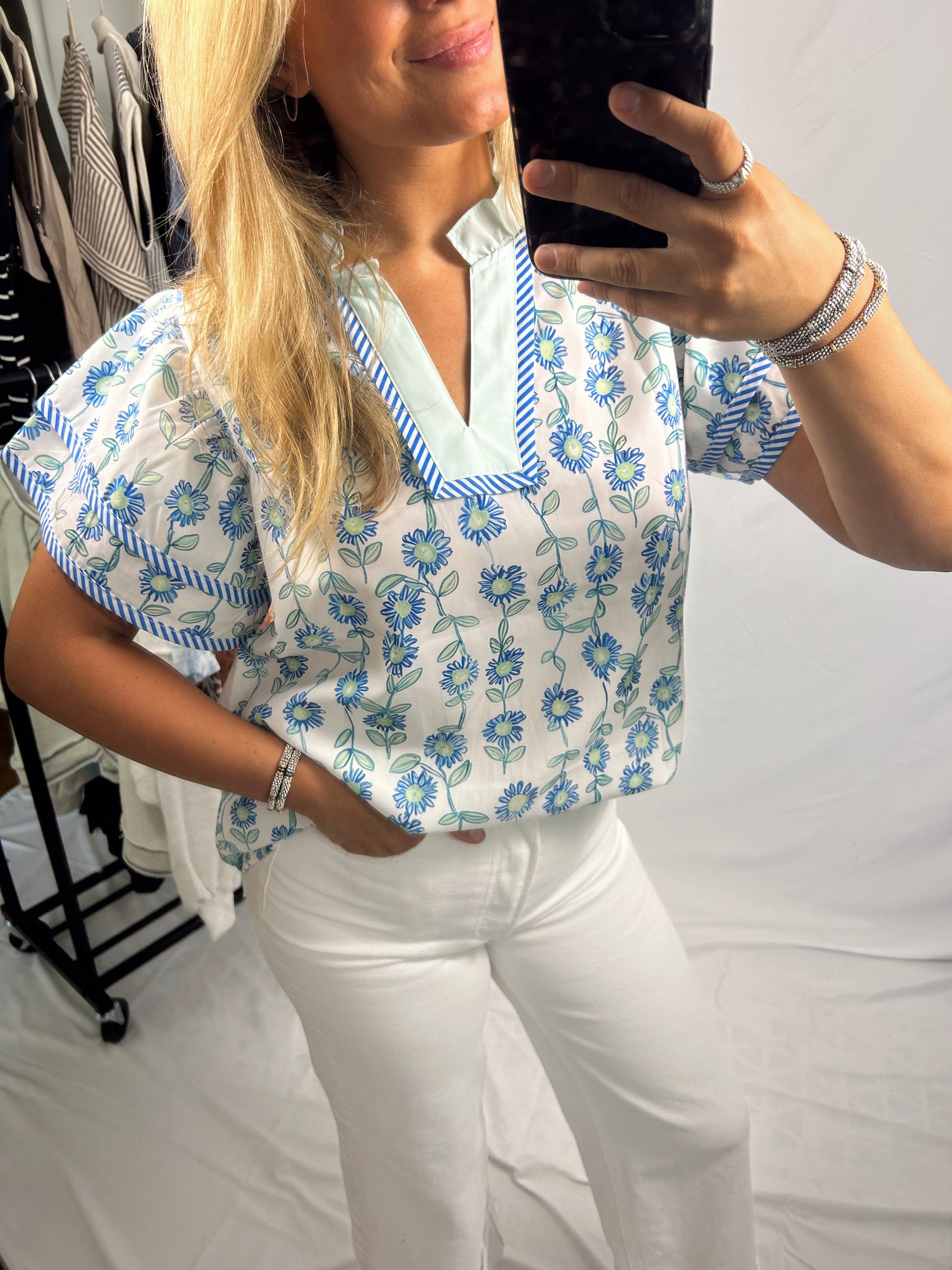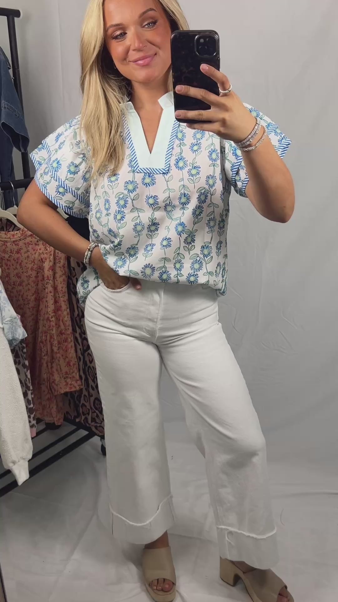 Easy, light, and made for sunny days. This flutter sleeve top with striped trim keeps things cute and casual, no effort needed.
