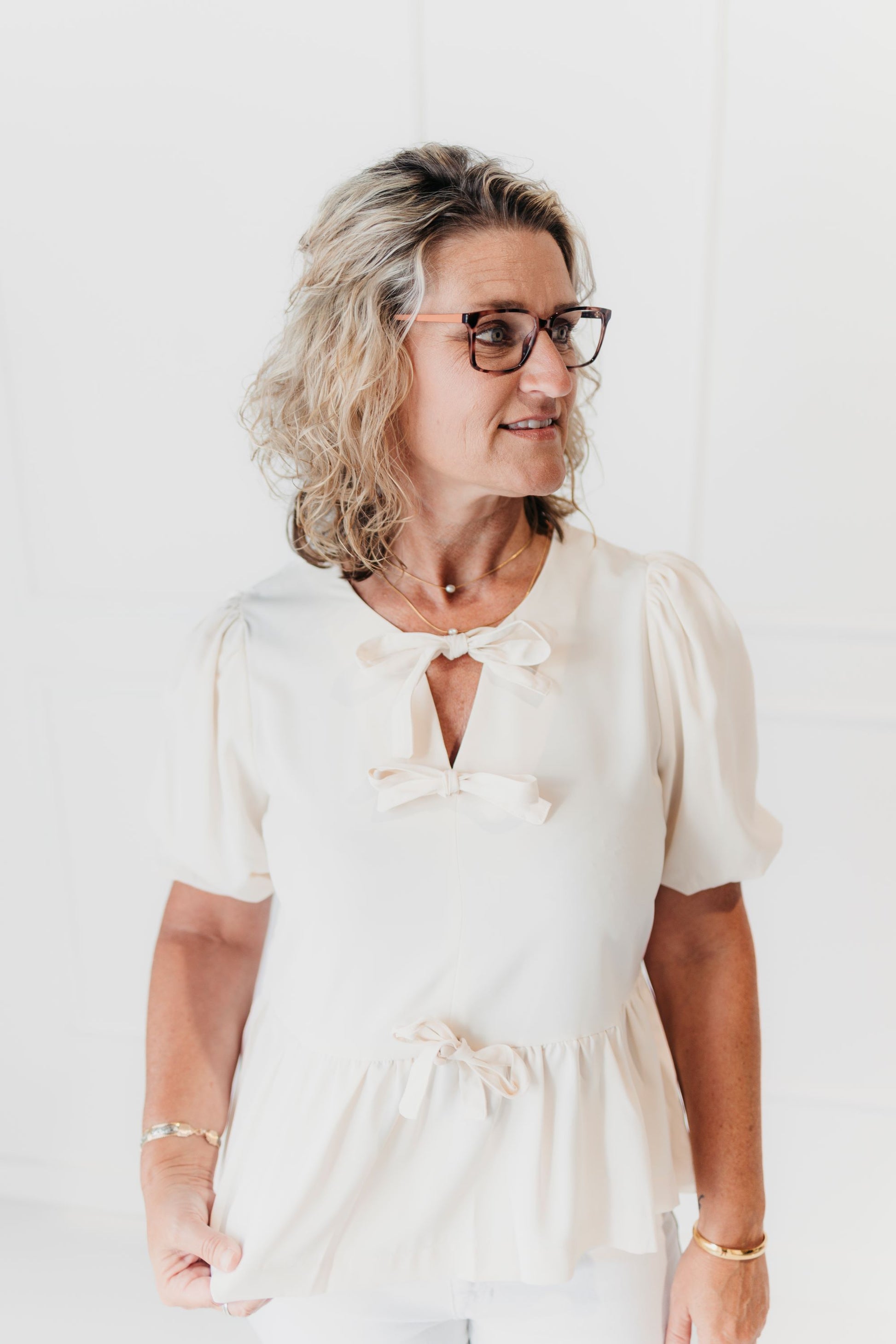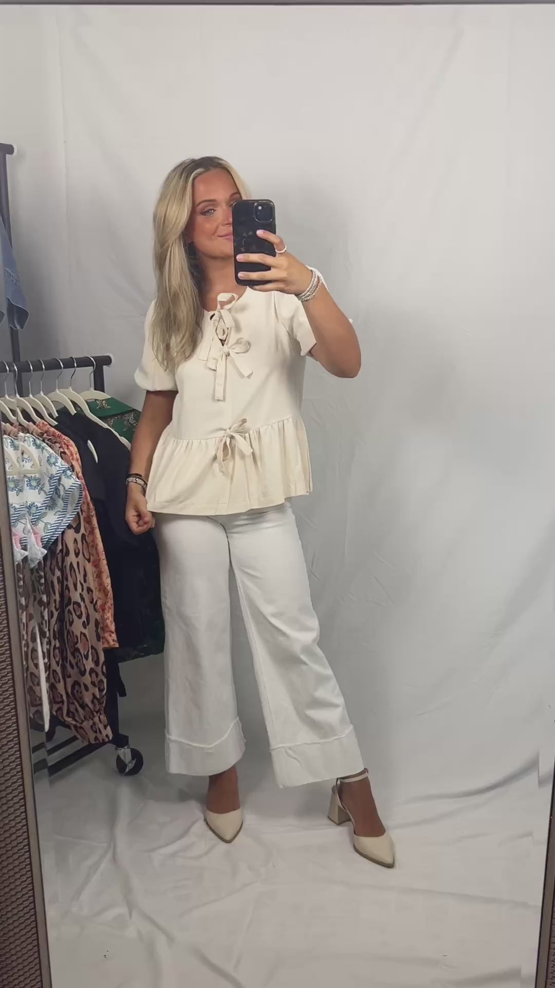 A statement piece made effortless. This puff sleeve peplum blouse features a bold front bow and sleek silhouette that pairs perfectly with high-rise denim or tailored pants.